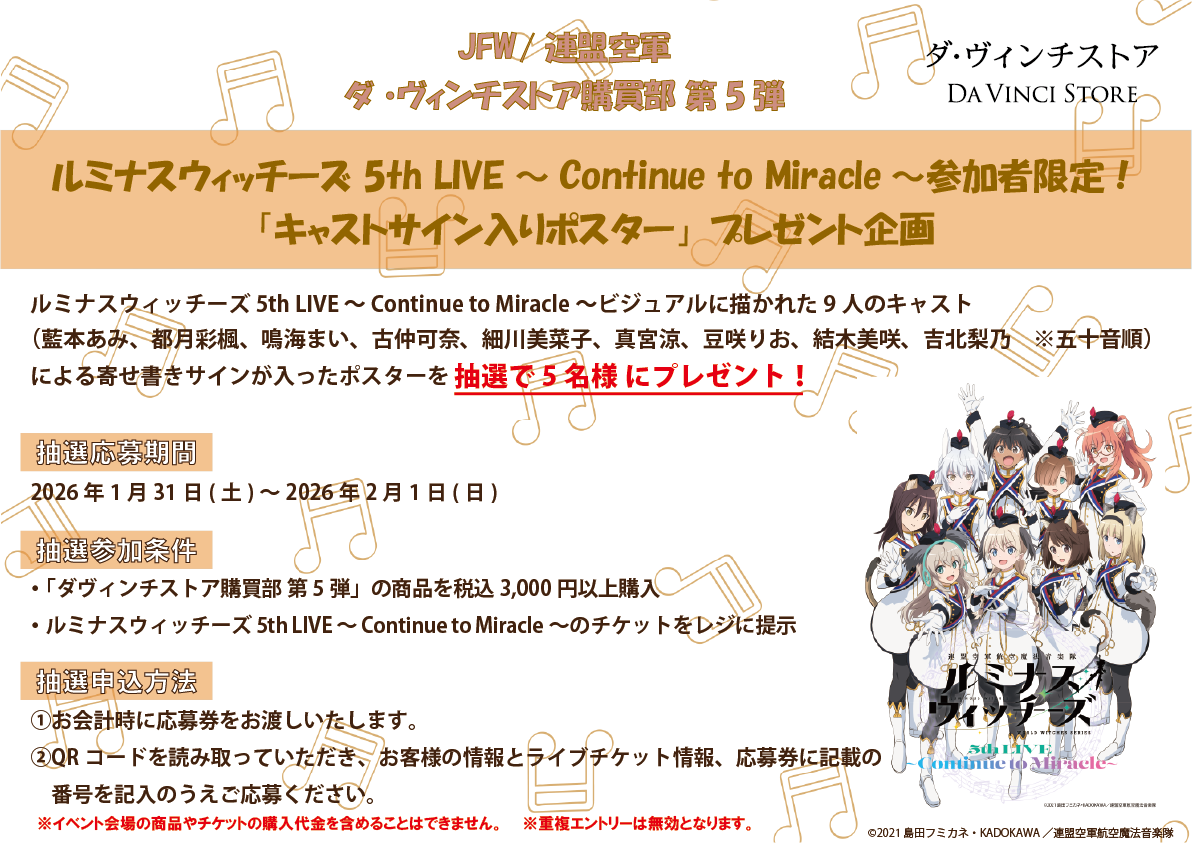 「JFW/連盟空軍ダ・ヴィンチストア購買部」コーナー内の第5弾オリジナル商品をお買い上げの方かつ、「ルミナスウィッチーズ5th LIVE~Continue to Miracle~」参加者限定で、今回も「キャストサイン入りポスター抽選会」を開催します!