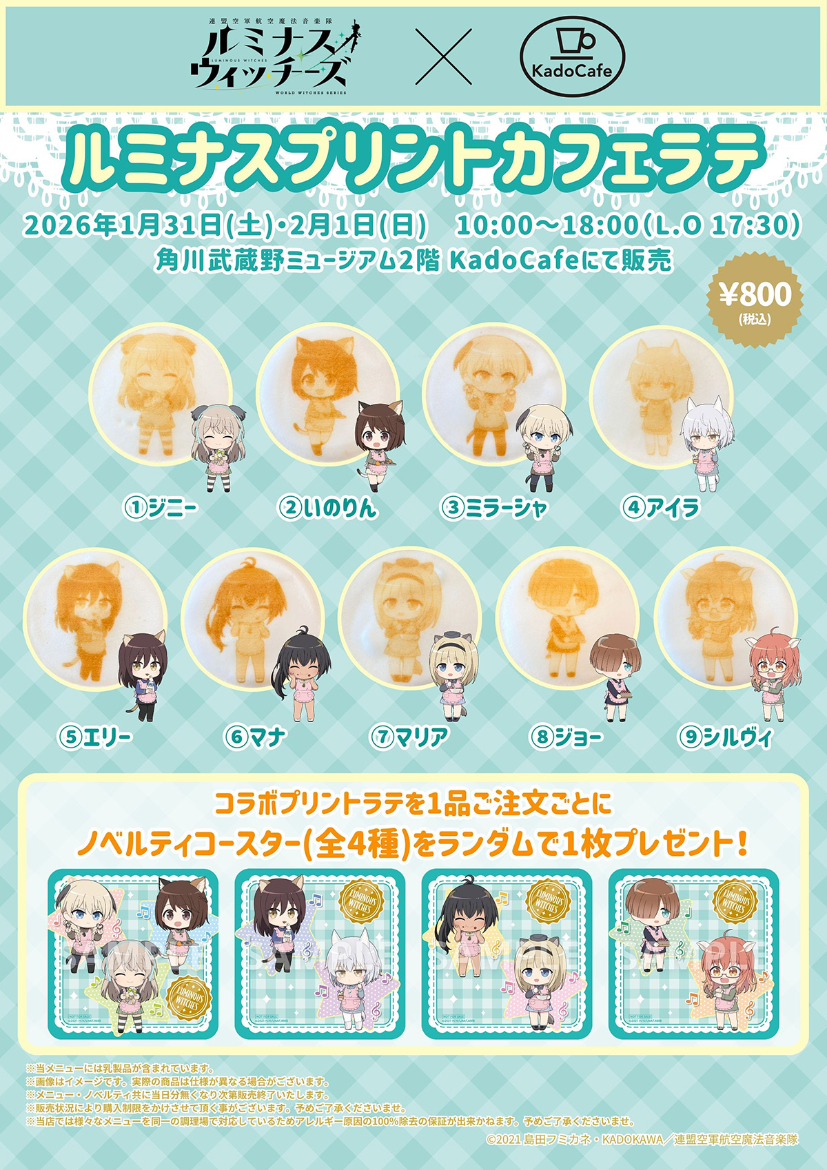 コラボプリントラテを1杯ご購入毎に、ノベルティとしてオリジナルコースター(全4種)をランダムで1枚プレゼント!